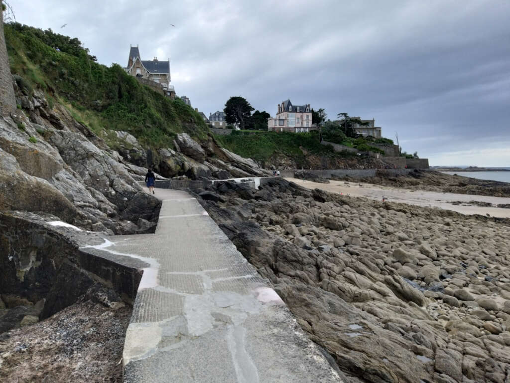 Dinard na drugi strani zaliva, od nekdaj namenjen bogatim gostom, je sicer predvsem letoviški kraj, a če ste tam ob oseki, ponuja slikovito obalno pot v obe smeri, ob kateri se vijejo mogočne granitne skale, na vrhu pečin gnezdijo stare premožnejše vile, odpira pa se nepozaben razgled na Saint Malo ter niz skalnatih otočkov in čeri, ki jih je razgalilo odmaknjeno morje.