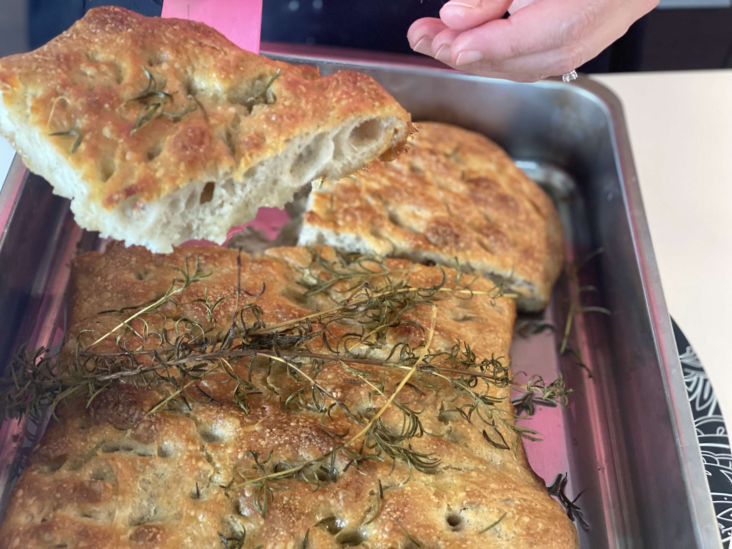 - Testo lahko daste takoj po potegih in prepogibih v naoljen pekač in pustite da vzhaja v pekaču. Ko je testo lepo vzhajalo, z blazinicami prstov obeh rok naredim nežne luknjice, kot je prikazano v videu. Nato pokapljam še z oljem in obložim z rožmarinom ter pečem.