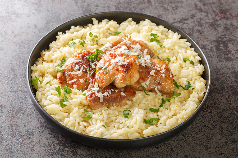V isti ponvi podušite še piščanca, dokler se sokovi ne izločijo. Po potrebi dodajte olivno olje. Dodajte riž, šparglje in mešanico limoninega soka in zelenih začimb ter posolite. Dobro premešajte, da se sestavine povežejo. Postrezite z zeleno solato. Dober tek.