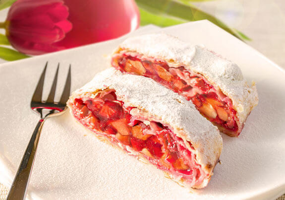Jagode operite in narežite na kocke. Dajte jih v skledo, dodajte sladkor, vanilijev sladkor in XuXu ter jih marinirajte približno 15 minut. Testo za štrudelj razvaljamo na vlažni brisači. Jagode odcedite v cedilu, da sok odteče, in jih položite na testo. Zavijte štrudelj in oba konca stisnite skupaj. Z ostrim nožem naredite nekaj zarez na vrhu. Previdno ga položite na pekač, obložen s papirjem za peko. Premažite ga s stopljenim maslom. Približno 40 minut pecite pri 180 °C. Ko se ohladi, ga posujte s sladkorjem v prahu in postrezite.