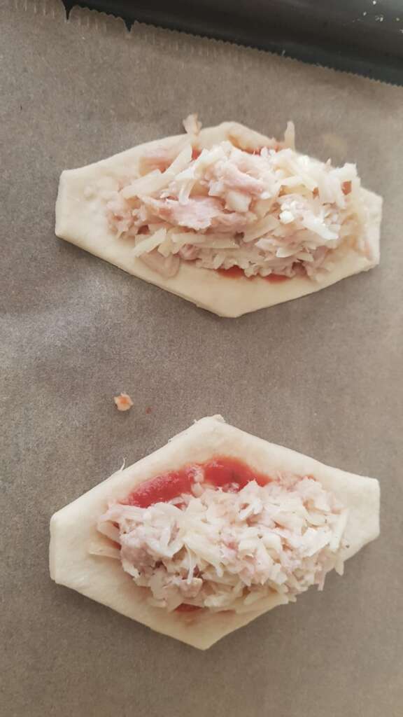 Testo razvaljamo na približno 2 mm debeline in izrežemo “krste”. Na spodnjo stran krste iz testa namažemo pelate, dodamo mešanico sira, tune in soli (nadev) ter prekrijemo z drugo plastjo testa. Robove pritisnemo skupaj z vilico, premažemo z rumenjakom in spečemo. Vse skupaj pečemo na 185 stopinj, približno 20 minut.