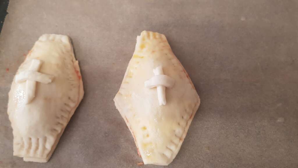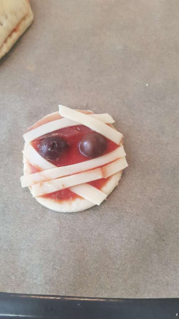 Testo razvaljamo na približno 2 mm debeline debeline, izrežemo krog, na sredini namažemo s pelati. Iz oliv, ki smo jih narezali na krogce, naredimo oči, na “čelo” položimo rezine šunke oziroma pršuta in s sirom, ki ga narežemo na trakce, naredimo vzorec povojev. Vse skupaj pečemo na 185 stopinj, približno 10-15 minut.