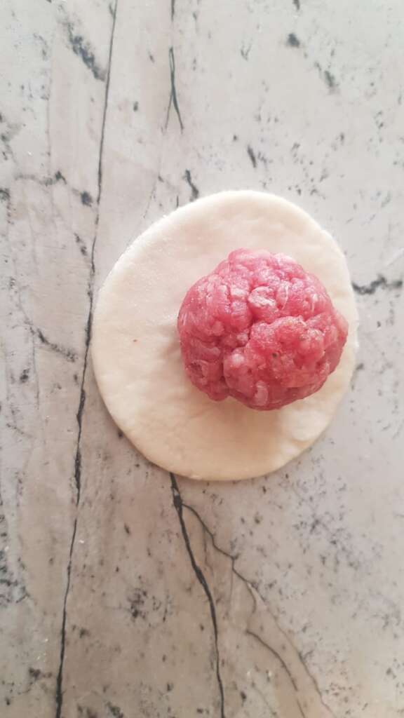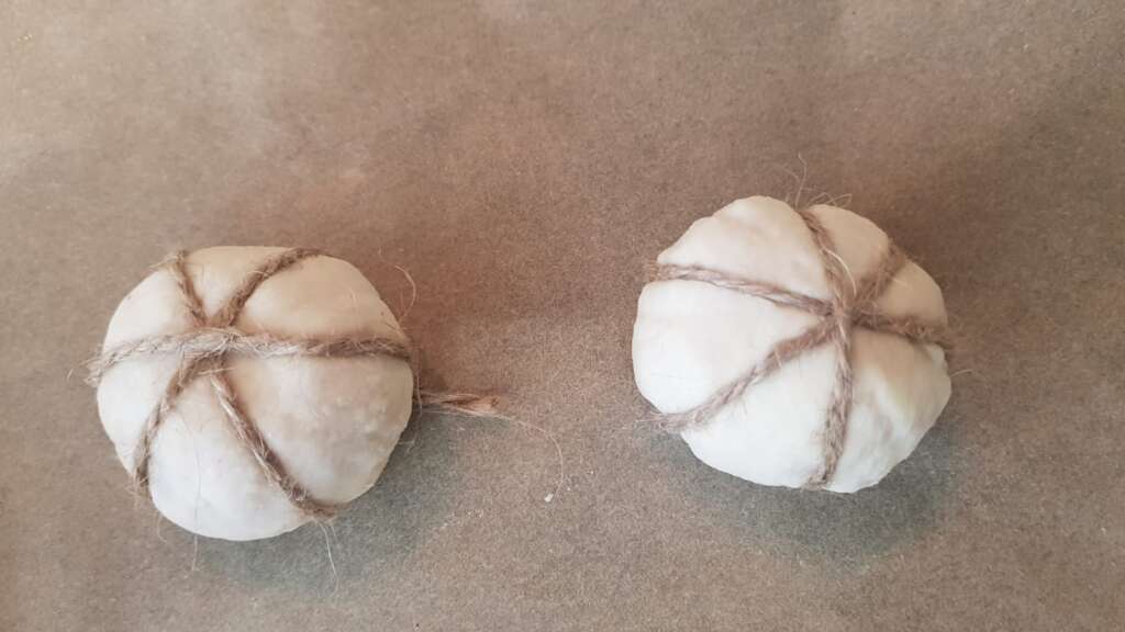 Meso začinimo s soljo in poprom, dodamo česen, čebulo in na kocke narezan toast. Oblikujemo kroglice, tako da damo v sredino košček mocarele. Iz testa, ki smo ga razvaljali na približno 2 mm debeline izrežemo krogce s premerom 8 cm in z vsakim izmed njih “oblečemo” kroglico. Z vrvico navzkrižno delamo vzorce buče (prikaz v videu), ki jo na vrhu malo potlačimo ter zapičimo pecelj. Pečemo na 185 stopinj.