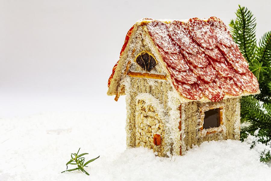 Okrasitev hišic iz medenjakov je ena naših najljubših prazničnih tradicij. Letos smo ob noči čarovnic okrasile hišice s piškoti in strašljivimi dodatki, za božič pa načrtujemo tradicionalno hišo iz medenjakov, zdaj pa smo na svoj seznam prazničnih opravil dodale še eno vrsto hišice. Delikatesne hišice so najnovejši trend praznične hrane, ki ga boste želele poskusiti čim prej. Da, prav ste prebrale: najnovejši trend praznične hrane vključuje zamenjavo medenjakov, zaledenitve in sladkarij za narezke, sirne kocke in svežo zelenjavo.