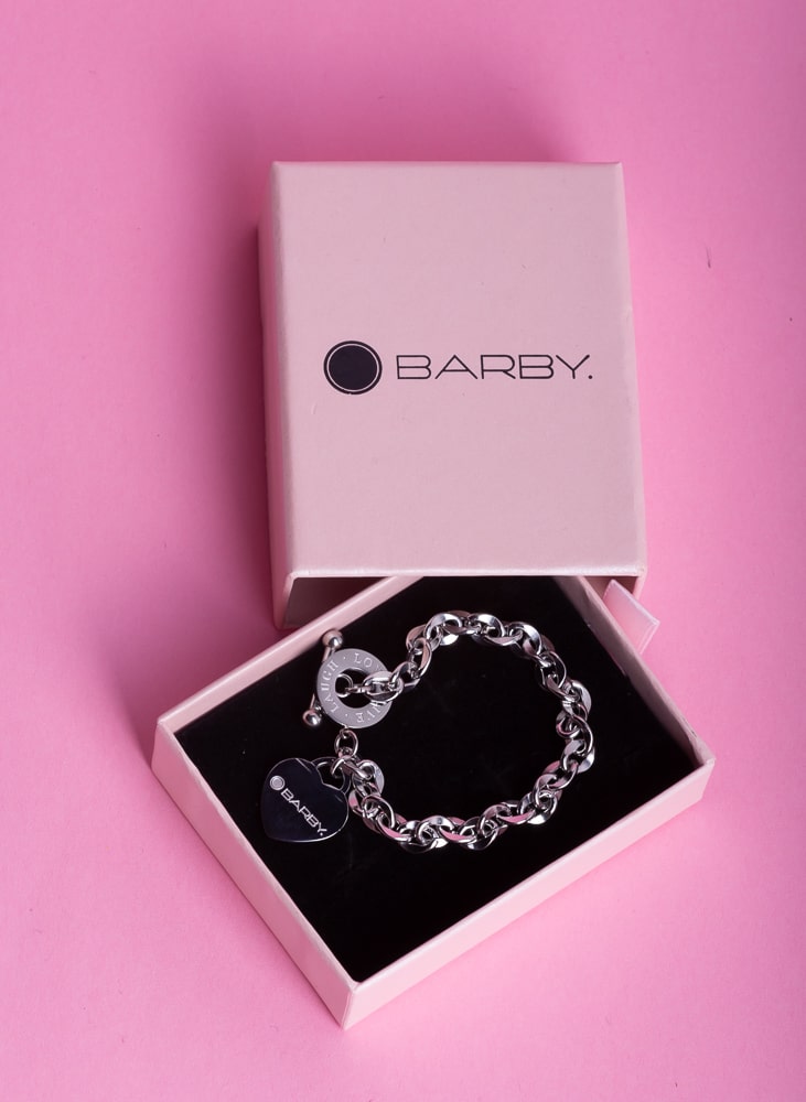 Ravno prav kičasta zapestnica BARBY., s srčkastim obeskom in napisom LIVE (ŽIVI) LOVE (LJUBI) LAUGH (SMEJ SE), da ne pozabimo, kaj je v življenju res pomembno. Nosi se lahko samostojno ali kot dodatek BARBY. zapestni uri. Seveda ne bo nič narobe, če bo družbo delala tudi kakšni drugi uri.