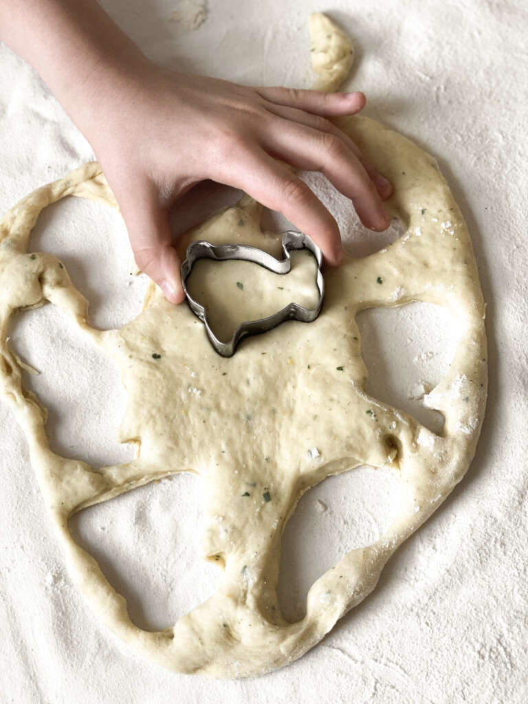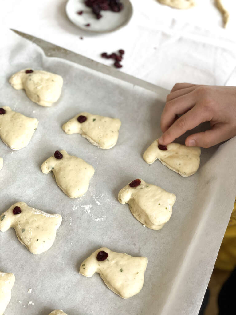 - Vzhajano testo na rahlo pomokani površini nežno razvaljamo za prst debelo in z modelčkom za piškote v obliki zajčka izrežemo poljubne zajčke ter vsakemu posebej z rozino ali brusnico naredimo oko.