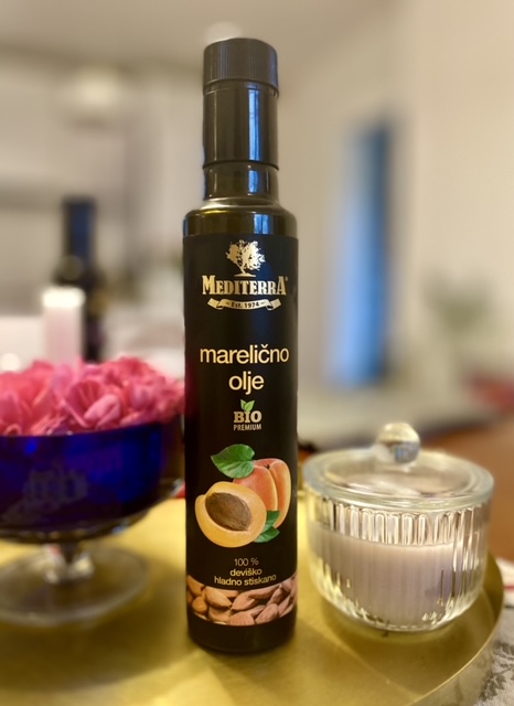 Običajno malico iz skute, nekaj orehov, žličke eritritola in ščepca cimeta sem oplemenitila z žlico hladno stiskanega Mediterrinega mareličnega olja. Mmmmm … Okusi so se čudovito povezali in odkrila sem olje, ki bo postalo stalnica v moji kuhinji.